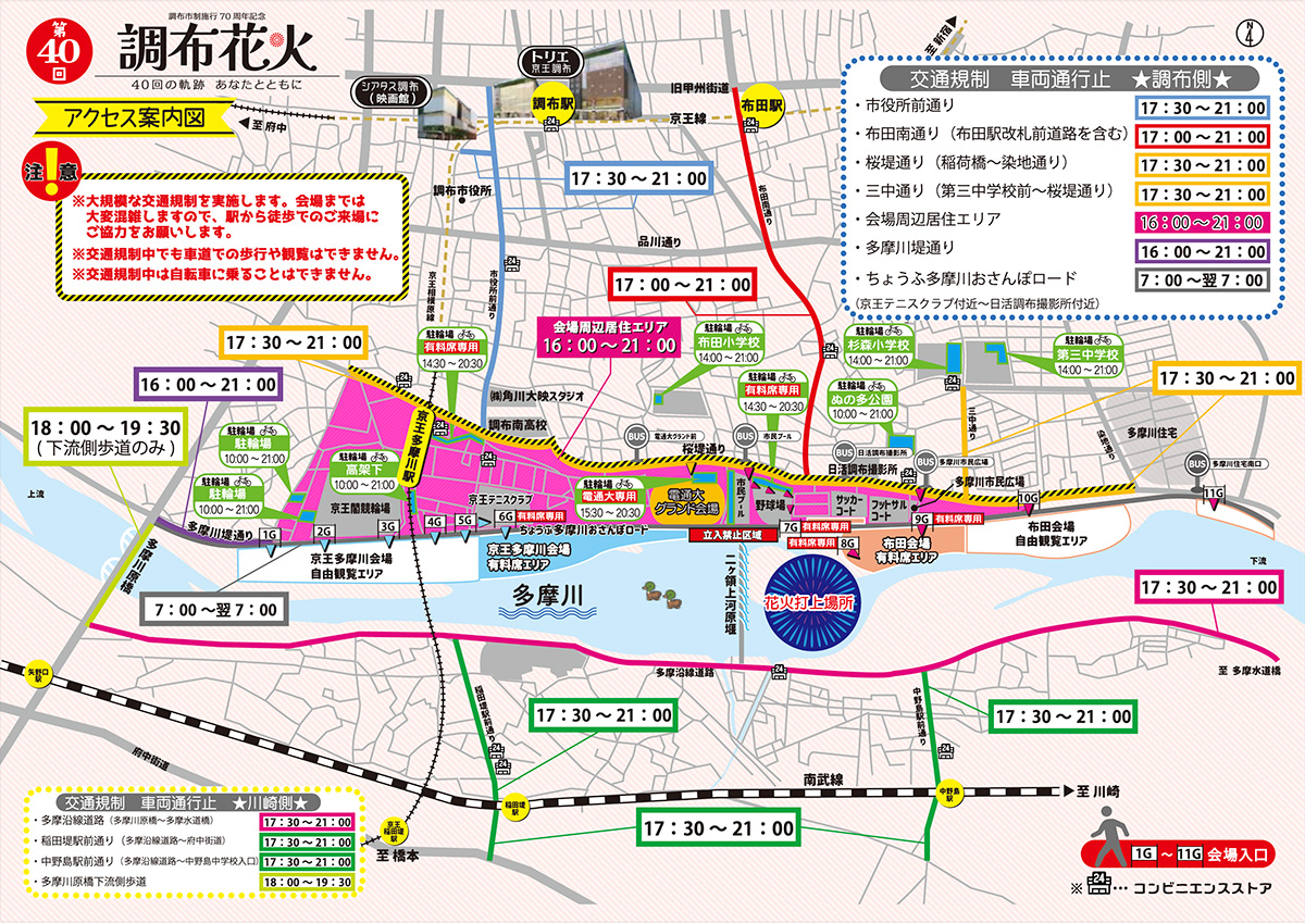 京王多摩川会場 | 京王多摩川駅(花火終了後に大変な混雑が予想されます)※ | 徒歩10分 |